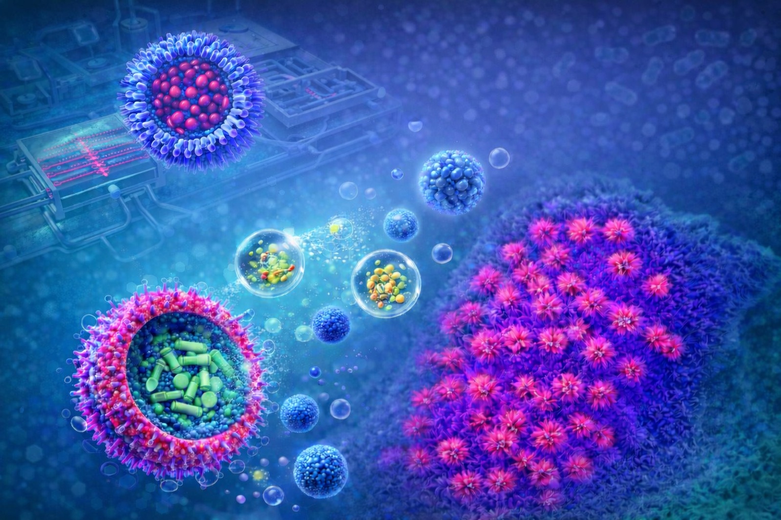 In Blau- und Rottönen gehaltene schematische Abbildung von runden Partikeln mit Medikamenten sowie Zellgewebe.