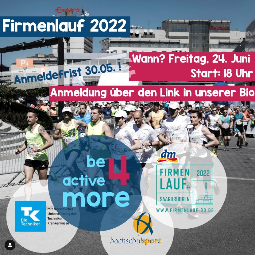 In diesem Jahr startet die Uni beim Firmenlauf in Saarbrücken, der am Freitag, 24. Juni 2022 stattfindet. Gestartet wird um 18:00 Uhr. Anmeldeschluss ist Montag, 30. Mai 2022 um 9 Uhr.