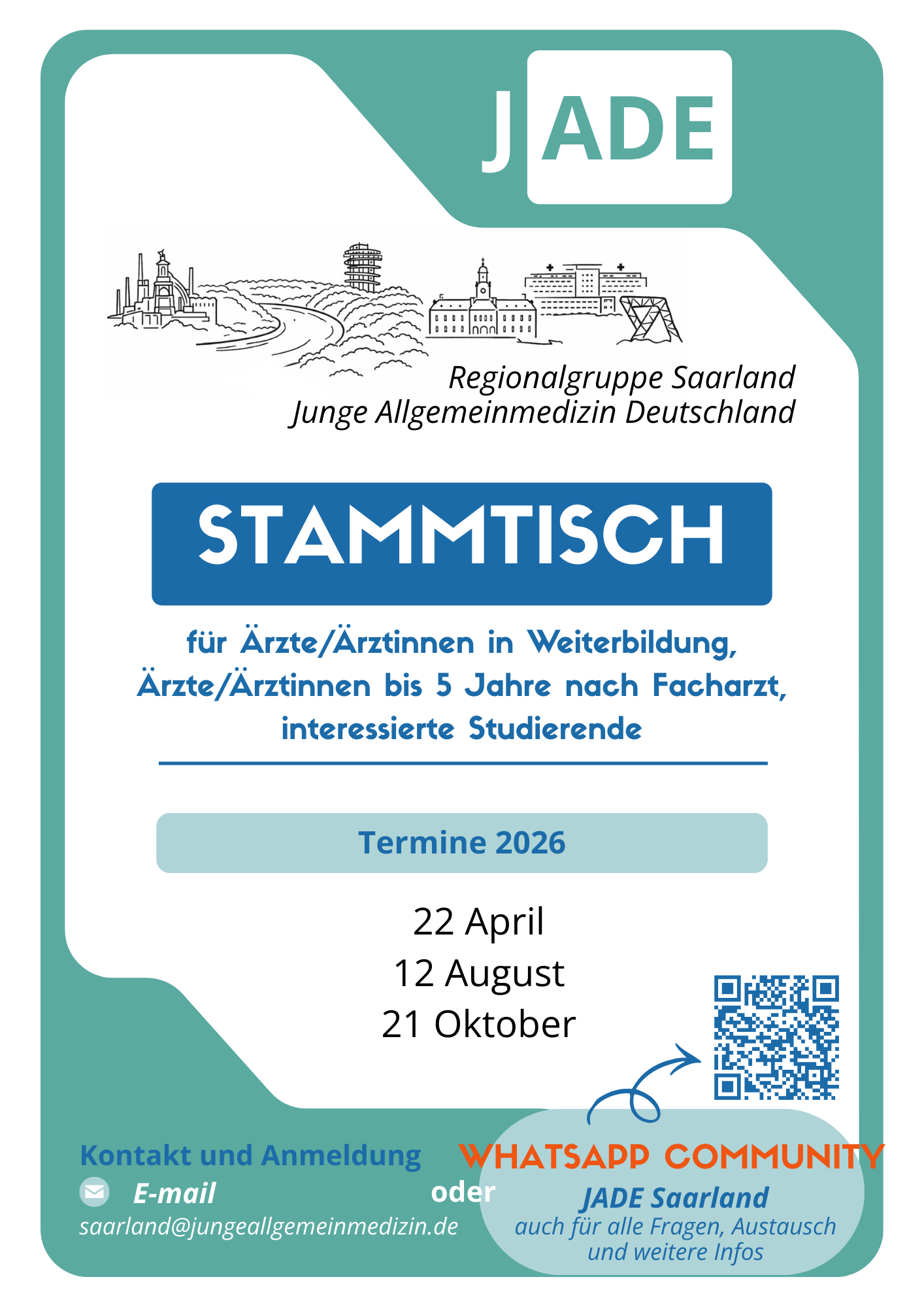 Die Stammtische 2026 werden stattfinden am 04.02., 22.04., 12.08. und 21.10. Weitere Informationen bekommt Ihr in unserer WhatsApp Gruppe oder schreibt uns gern eine Mail an saarland(at)jungeallgemeinmedizin.de