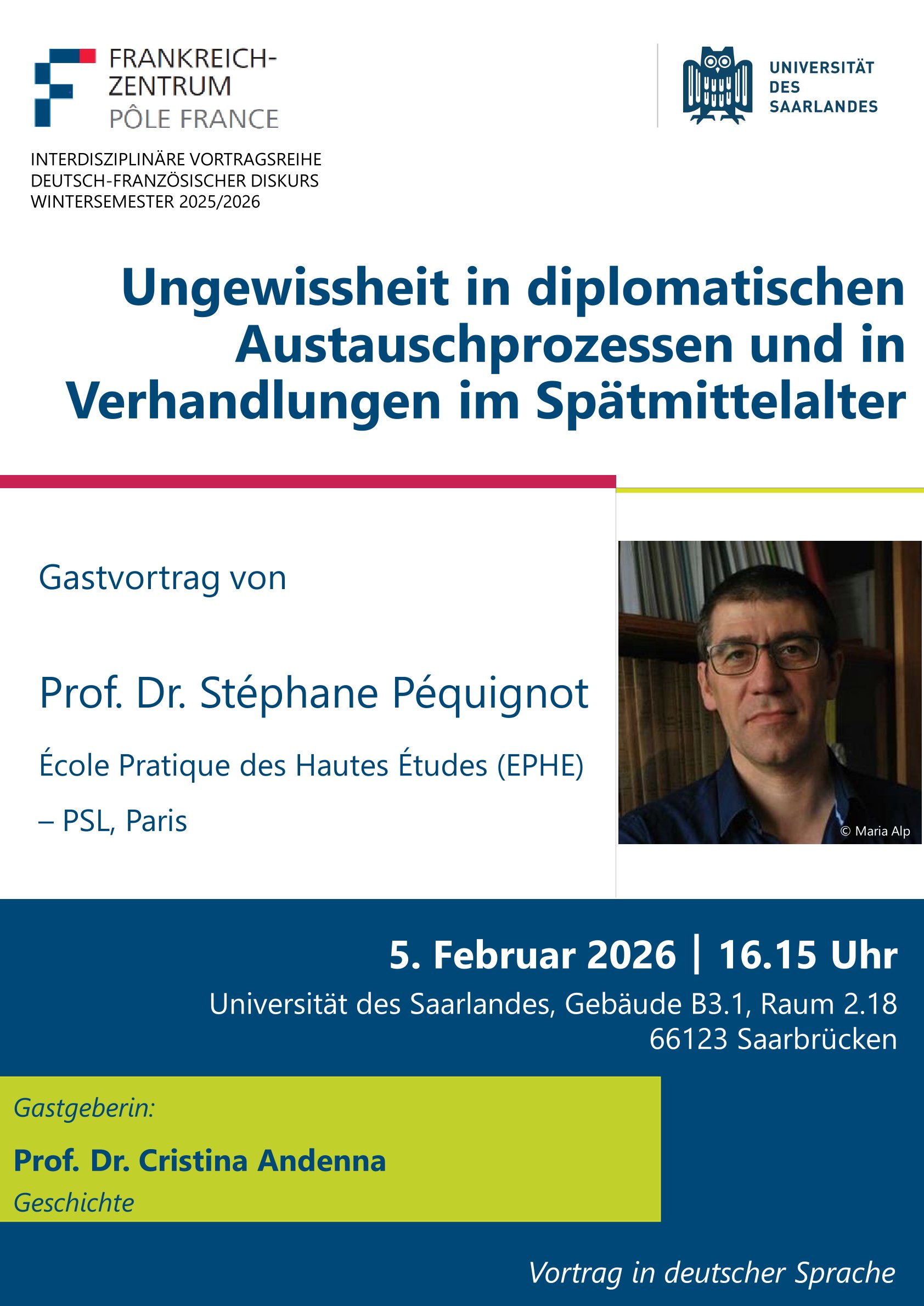 Der diplomatische Austausch und insbesondere die diplomatischen Verhandlungen finden häufig in einem Horizont der Ungewissheit statt. In diesem Vortrag soll dieses in der Geschichtsschreibung wenig beachtete Phänomen aus drei sich ergänzenden Blickwinkeln betrachtet werden. Zunächst sollen Entwicklungen im Umgang mit Unsicherheit und Zweifel in der Diplomatie aufgezeigt werden. Dazu werden Fürstenspiegel, Botschafterberichte und Kommunikation zwischen den Mächten herangezogen sowie Schriften über die Kunst des Verhandelns untersucht. Ein weiterer Schwerpunkt liegt darauf, die Situationen und Ereignisse im Spätmittelalter, insbesondere im westlichen Mittelmeerraum, in denen die verschiedenen Akteure der Diplomatie mit Ungewissheit konfrontiert waren, zu charakterisieren. Angesichts dieser wiederkehrenden Schwierigkeiten bildete sich ein Verhandlungs-Know-how heraus. Dieses wird durch eine vergleichende Studie der dokumentarischen und kurialen Praktiken von Botschaftern sowie durch Fallstudien in diplomatischen Krisensituationen untersucht. Dieser Forschungsvorschlag ist Teil einer historiografischen Bewegung, in der die in Deutschland, Frankreich und anderen Ländern durchgeführten Forschungen seit etwa zwanzig Jahren im regelmäßigen Austausch stehen.