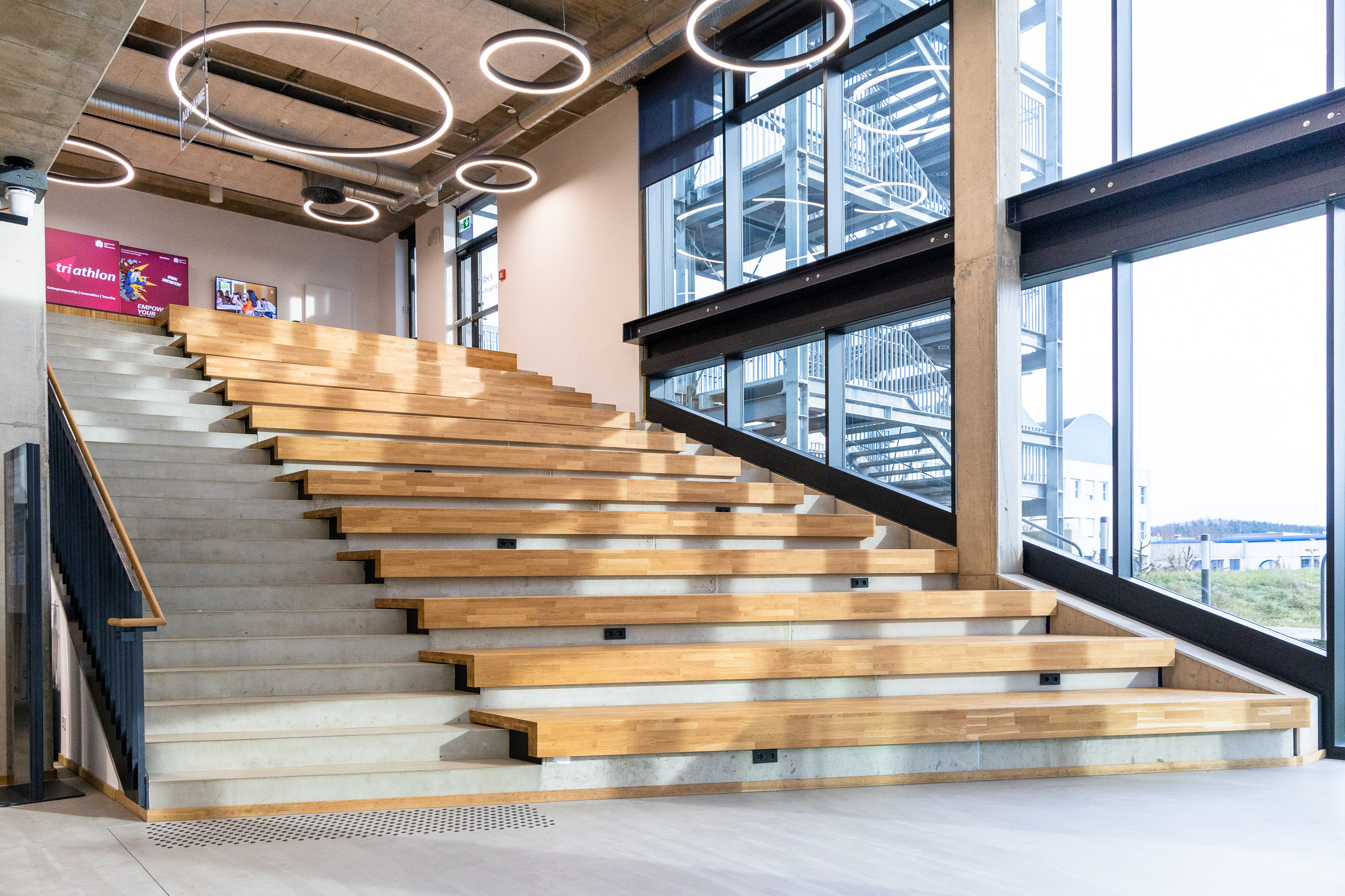 Mit Unterstützung von Triathlon - Ökosystem für Entrepreneurship, Innovation und Transfer an der Universität des Saarlandes - bietet das Innovation Center Gründungsinteressierten, Start-ups, Forschenden und Unternehmen organisatorische und serviceorientierte Unterstützung. Das Gebäude schafft den räumlichen Rahmen für Begegnung und Zusammenarbeit: Von der offenen Erdgeschosszone mit Entree, Cafeteria, Ausstellung und Sitztreppe über flexible Open-Space-Bereiche bis hin zu Büroflächen und Seminarräumen – die Architektur ermöglicht graduelle Abstufungen zwischen Öffentlichkeit und Privatheit beim Arbeiten. Seit seiner Eröffnung im April 2024 hat sich das Gebäude als lebendiger Treffpunkt etabliert: