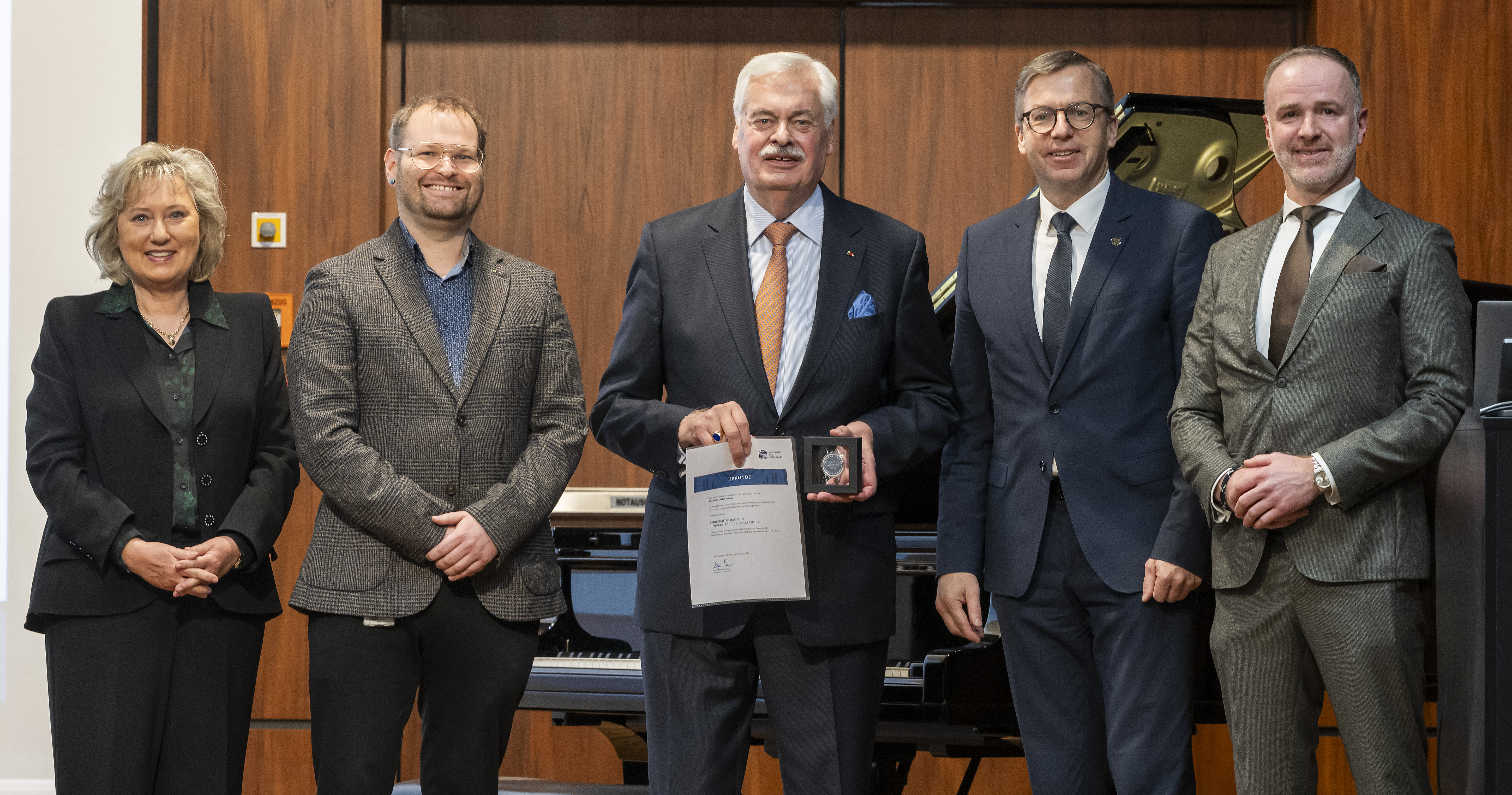 © UdS/Jörg PützDer saarländische Unternehmer Dieter Scheid wurde gestern als „Ehrenmitglied“ der Universität des Saarlandes gewürdigt. Bei der Preisverleihung waren dabei (v.l.n.r.): Professorin Andrea Gröppel-Klein (FR Wirtschaftswissenschaft), Lukas Redemann (Senat), Ehrenmitglied Dieter Scheid, Universitätspräsident Ludger Santen und IHK-Hauptgeschäftsführer Frank Thomé.