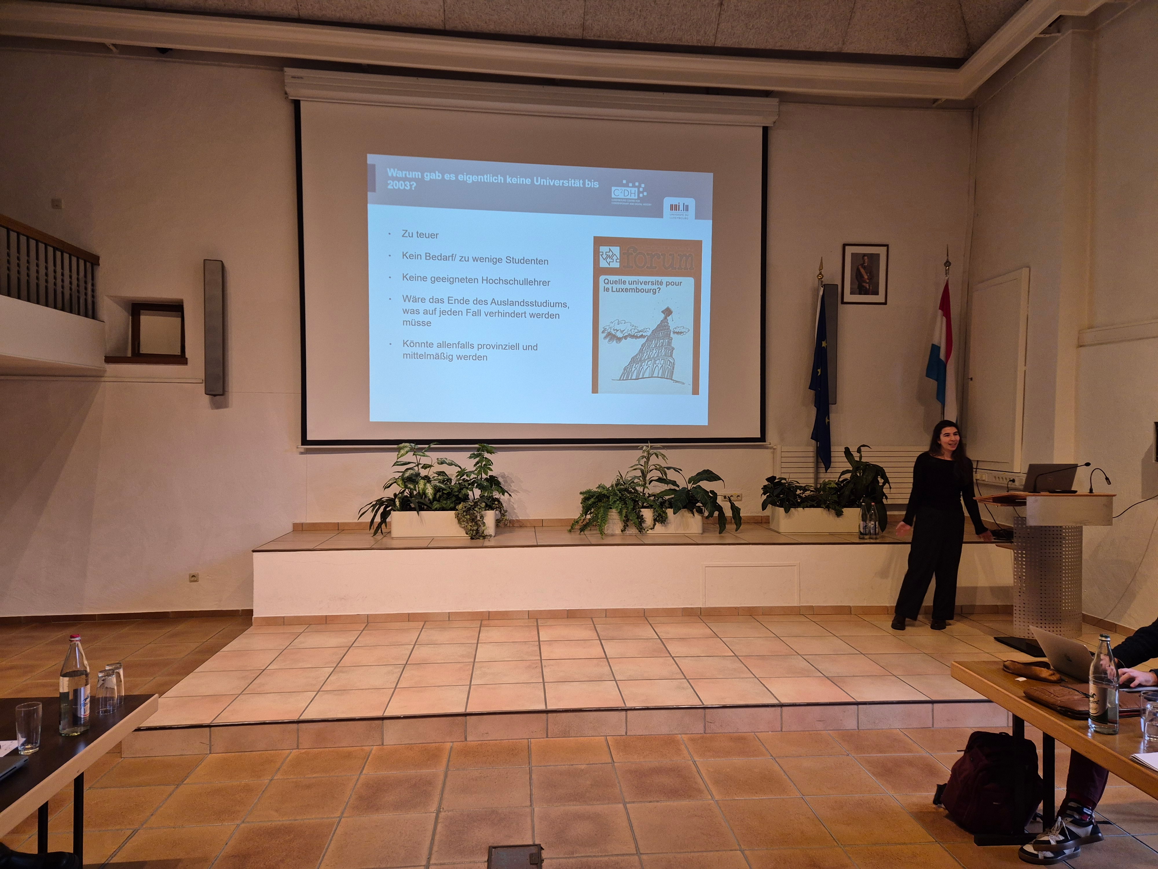 Der zweite Workshoptag startete mit dem Vortrag von Almuth Axtner (Université du Luxembourg), die in ihrem Dissertationsprojekt die Geschichte der Universität des Großherzogtums aufarbeitet. Die Universität Luxemburg wurde 2003 als erste Volluniversität des Landes gegründet. In der Quellenarbeit beschäftigte sich das Plenum mit Zeitungsartikeln aus der Luxemburger Autorenzeitschrift forum, die 2003 ebendieser ein Sonderheft widmete. Die Referentin gab spannende Einblicke in die Vorgeschichte der Universitätsgründung und klärte vor allem die Fragen, warum es bis zu diesem Zeitpunkt noch keine Universität gab und was sich um die Jahrtausendwende änderte. Die Quellenarbeit und die anschließenden Ausführungen Axtners verdeutlichten, dass Anfang der 2000er-Jahre beispielweise die Abhängigkeit vom Ausland anders diskutiert und der Bologna-Prozess als positive Neuerung charakterisiert wurden. Daneben gelangte die Vorstellung, dass eine Universität als nützlich für die Gesellschaft anzusehen sei, häufiger aufs Tableau. Die wissenschaftliche Mitarbeiterin des C²DH wies darauf hin, dass verschiedene Positionen immer wieder auftauchten, aber oft wie zwei Seiten einer Medaille wirkten. Die Argumentation um das Für und Wider einer eigenen Universität wirke deshalb oft widersprüchlich. Insbesondere, wenn die Auslandsmobilität der Studierenden in die Diskussion einfloss, da diese in Luxemburg stets als zentrales Gut und wichtige Erfahrung für die jungen Erwachsenen angesehen wurde.