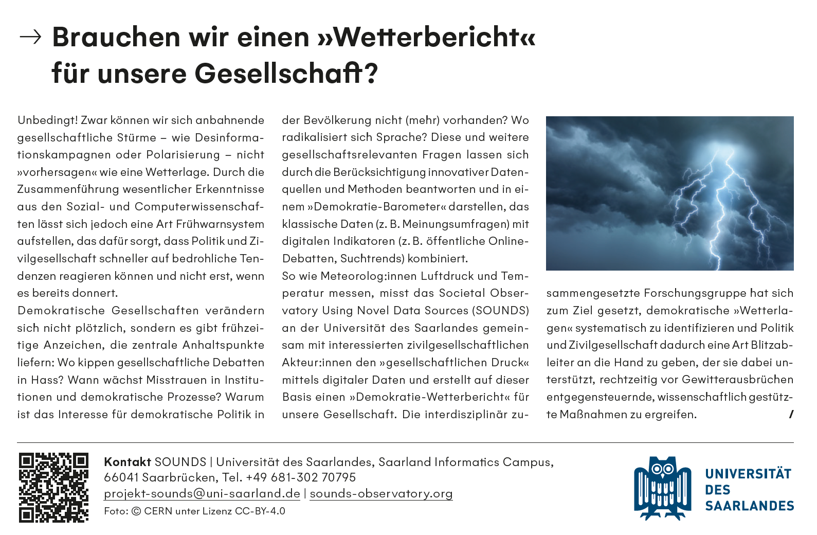 Anlässlich des 80-jährigen Jubiläums des Journals veröffentlicht “Die ZEIT” eine Wissenschafts-Sonderausgabe. „Brauchen wir einen Wetterbericht für unsere Gesellschaft?“. Die Antwort darauf liefert das von Prof. Dr. Daniela Braun und Prof. Dr. Ingmar Weber an der Universität des Saarlandes initiierte SOUNDS-Projekt, das vom Saarländischen Ministerium für Finanzen und der Wissenschaft aus dem Transformationsfonds gefördert wird. Es soll dazu beitragen eine Art Frühwarnsystem für die Stimmung innerhalb unserer Gesellschaft zu entwickeln - ein Demokratie-Barometer. Dazu kombiniert es interdisziplinär sozial- und computerwissenschaftliche Ansätze. Es untersucht gesellschaftliche Transformationsprozesse mithilfe innovativer Datenquellen wie Satellitenbildern, sozialen Medien und Barcode-Scannern. Ziel ist es, Computer- und Sozialwissenschaften zu vernetzen und den Einsatz datenintensiver Methoden zu stärken. Langfristig soll ein Institut entstehen, das auf den aufgebauten Strukturen basiert.