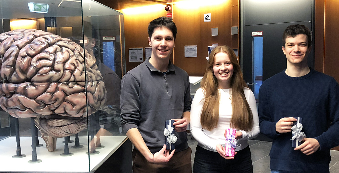 Drei TeilnehmerInnen teilten sich mit maximaler Punktzahl den Spitzenplatz, sie führen damit eine Gruppe von knapp einem Viertel der Studierenden an, die mindestens 25 oder mehr Punkte in der Klausur erreicht haben. Stellvertretend für diese Leistung überreicht die Kursleitung der makroskopischen Lehre, Prof. Gabriela Krasteva-Christ, den drei Studierenden, Karlotta Körber, Simon Valeske und Louis Wallisch eine kleine Aufmerksamkeit.