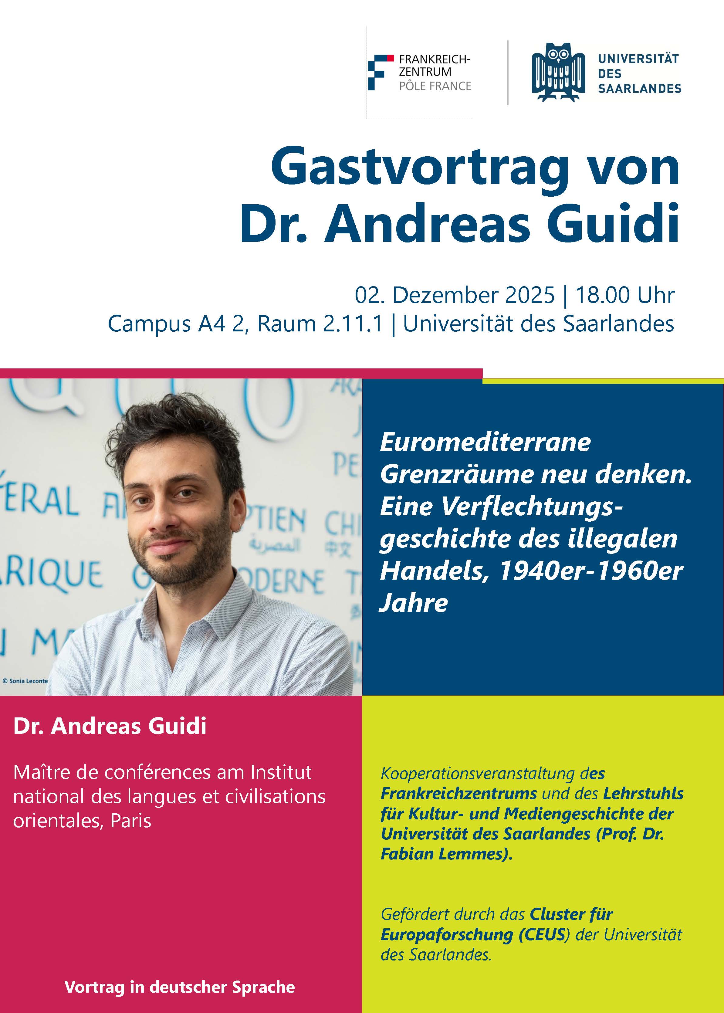 Andreas Guidi (Paris): Euromediterrane Grenzräume neu denken. Eine Verflechtungsgeschichte des illegalen Handels, 1940er–1960er Jahre (In Zusammenarbeit mit dem Frankreichzentrum und dem CEUS)