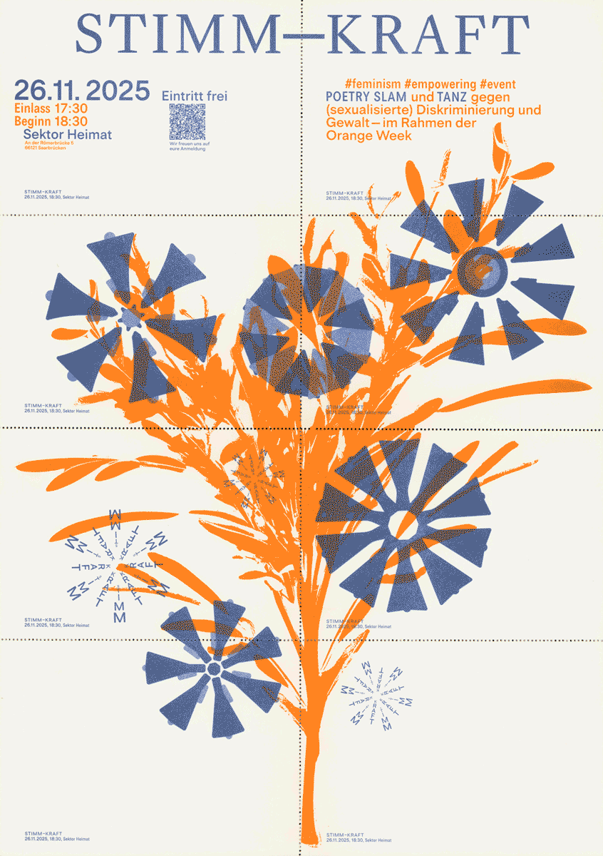STIMM-KRAFT öffnet im Rahmen der Orange Week einen Raum für die vielfältigen Stimmen von Frauen*, die allzu oft überhört oder zum Schweigen gebracht werden. Begleitet von der wortstarken Moderatorin Andrea Maria Fahrenkampf und renommierten Künstler*innen entfaltet sich ein Programm aus empowernden Performances im Poetry Slam-Format, das Unaussprechliches zu Gehör bringt und Stimme als Ausdruck von Widerstand erfahrbar macht.