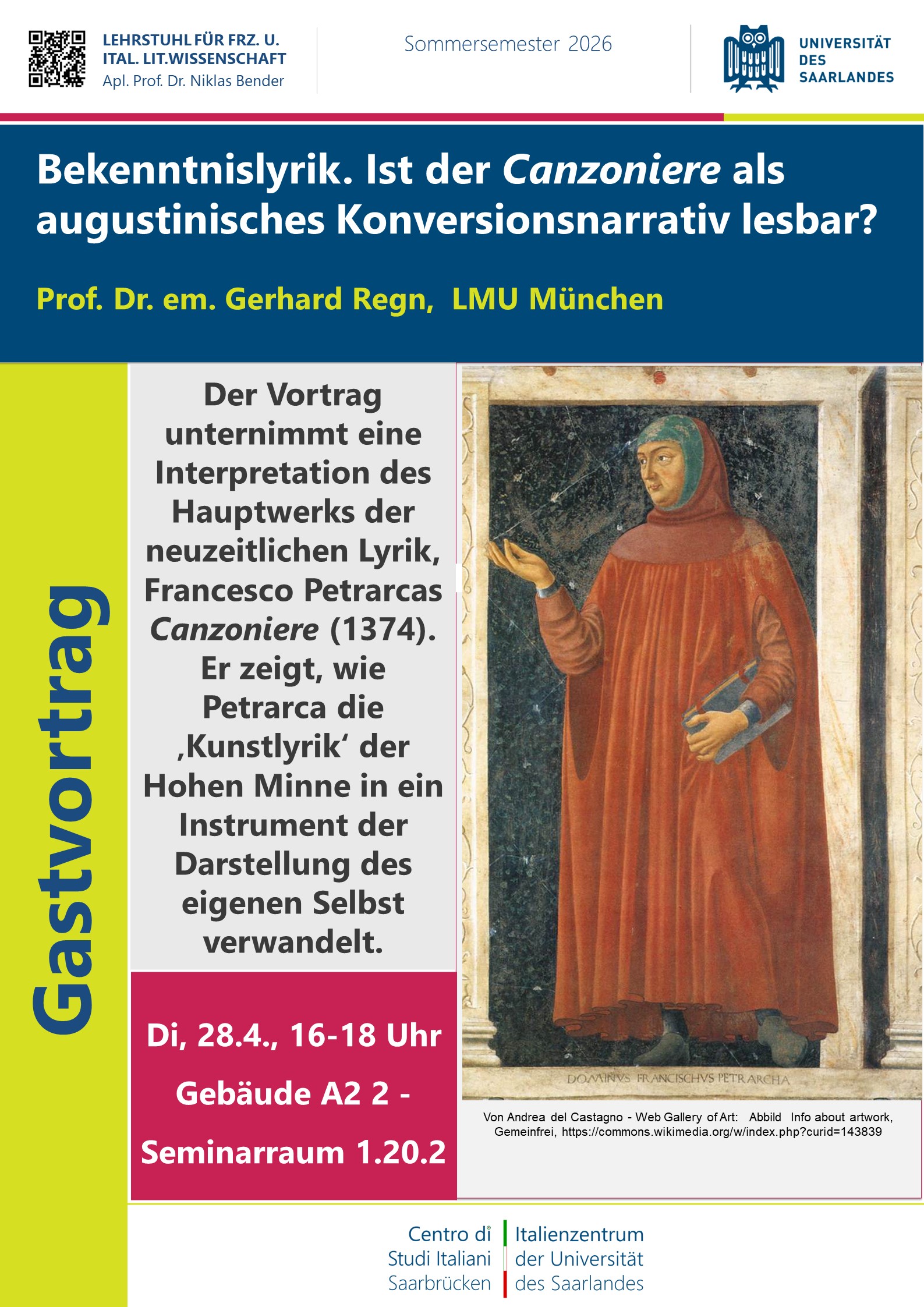 Am Dienstag, den 28.04. ab 16 Uhr ist Prof. Dr. em. Gerhard Regn von der LMU München mit seinem Vortrag: "Bekenntnislyrik. Ist der ‘Canzoniere’ als augustinisches Konversionsnarrativ lesbar?" in Geb. A2 2, Raum 1.20.2 zu Gast: