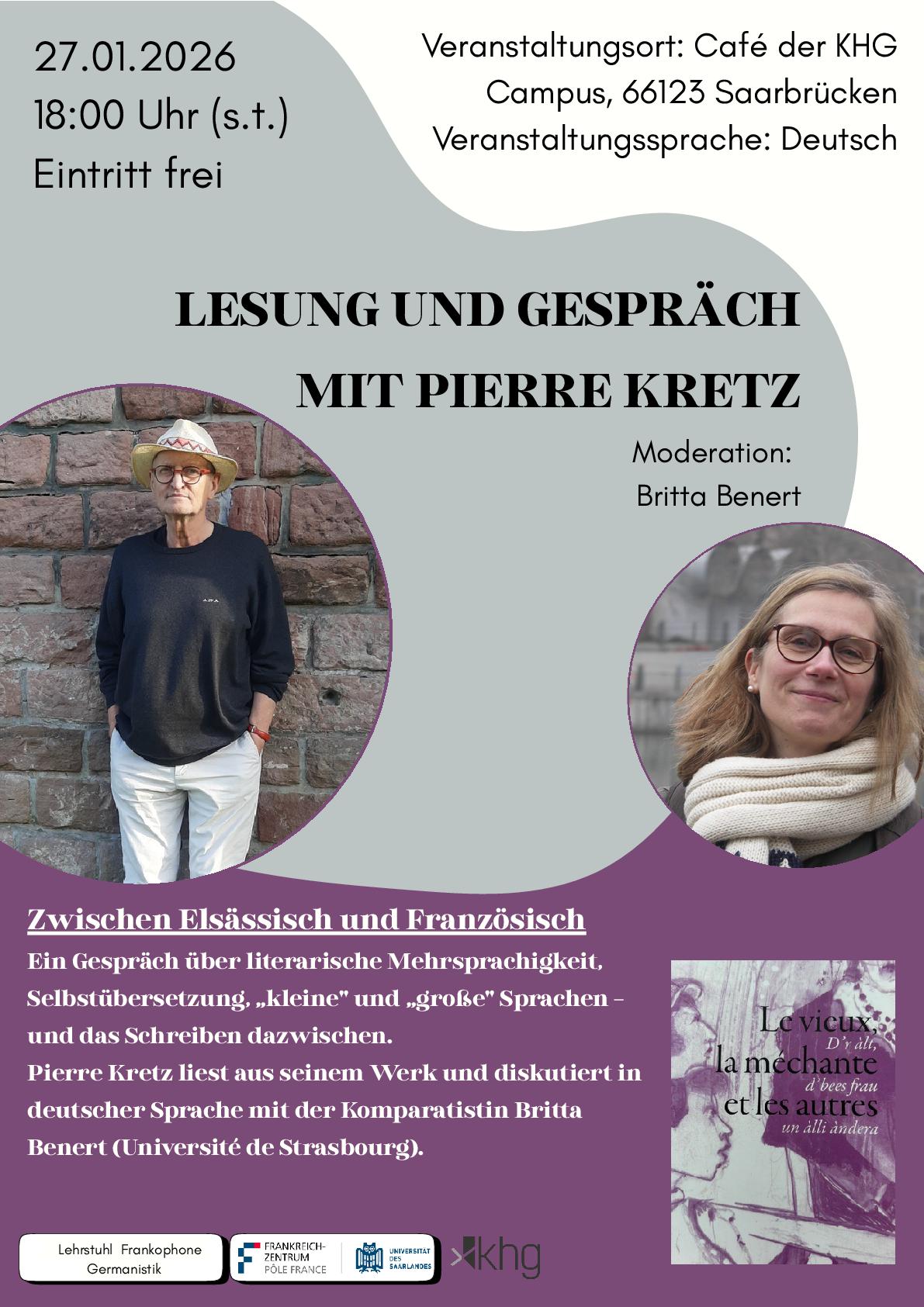 Ein Gespräch über literarische Mehrsprachigkeit, Selbstübersetzung, „kleine" und „große" Sprachen – und das Schreiben dazwischen. Der Schriftsteller Pierre Kretz liest aus seinem Werk Le vieux, la méchante et les autres und diskutiert in deutscher Sprache mit der Literaturwissenschaftlerin Britta Benert (Université de Strasbourg).